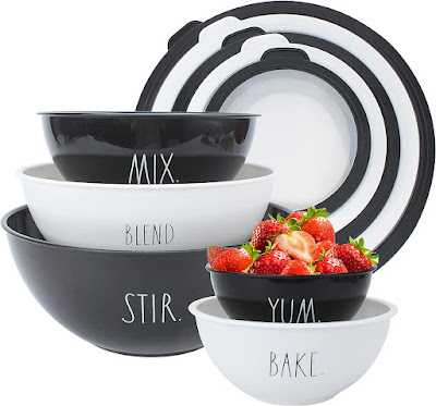 The Rae Dunn Mixing Bowls with Lids are a set of ten plastic nesting bowls that come with five prep bowls and five black lids.